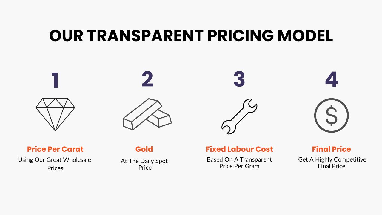 We provide a quote that outlines the diamond price per carat, gold at the daily spot price, and a fixed labor price per gram.